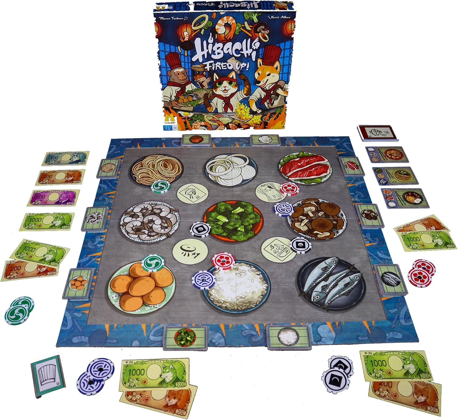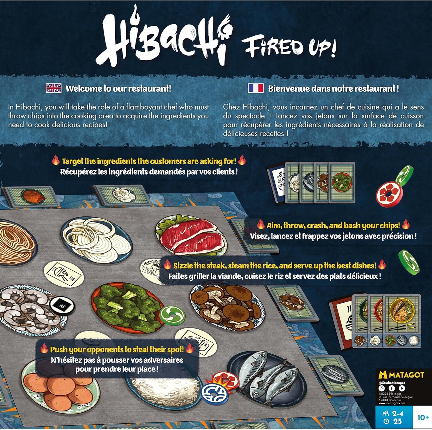 In Hibachi: Fired Up!, you will take the role of a flamboyant chef who must throw chips into the cooking area to acquire the ingredients you need to cook delicious recipes! This new edition of Hibachi features faster and more streamlined rules and a cheaper price point.