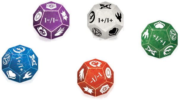 - Five 12-sided counters featuring 10 MTG keyword ability symbols, +1/+1, and -1/-1
