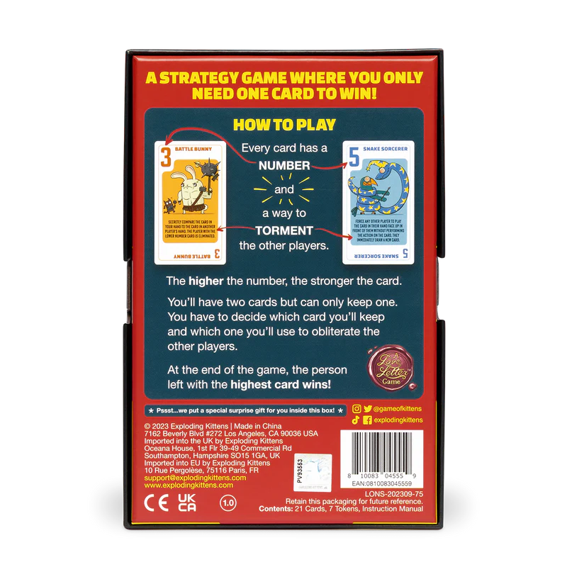 It’s the strategy game for people who HATE strategy games! Every card has a number and a way to torment the other players. The higher the number, the more vicious the card. You only have two cards, so decide which to keep and which to use to backstab, steal from, or obliterate the other players. That’s right, you only ever need to make one choice at a time–it’s a breeze…until it isn’t! In the end, the person left with the highest card wins! This is a Love Letter ™ Game that’s easy-to-learn, quick-to-play, and powerfully funny!