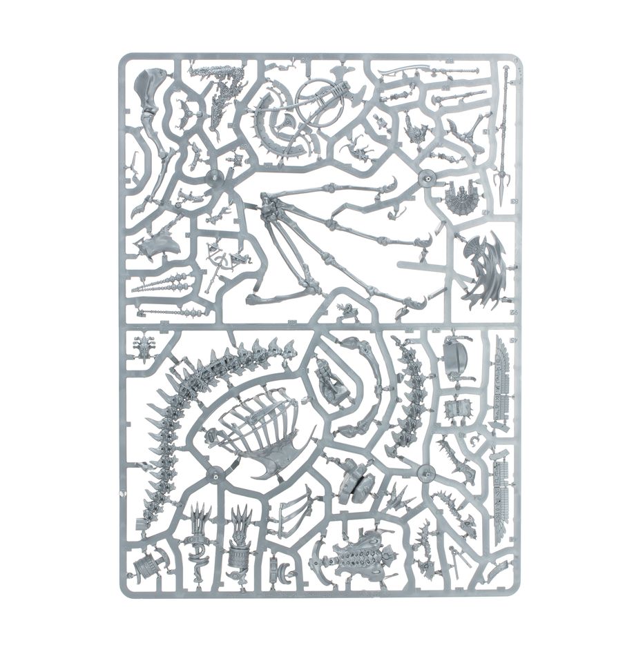 This multipart plastic kit builds a Tomb King or Liche Priest mounted on a Necrolith Bone Dragon. This terrifying centrepiece is the jewel of any Tomb Kings of Khemri army, dominating both battlefields and display cabinets. The Tomb King stands atop a grand, chariot-like platform on the Bone Dragon's back, and can be armed with a one-handed khopesh, an imposing great weapon, or a pronged cavalry spear. The Liche Priest instead sits on an ornate throne decorated with Mortuary Cult iconography, brandishing a ritual staff as they conjure a spectral vulture.