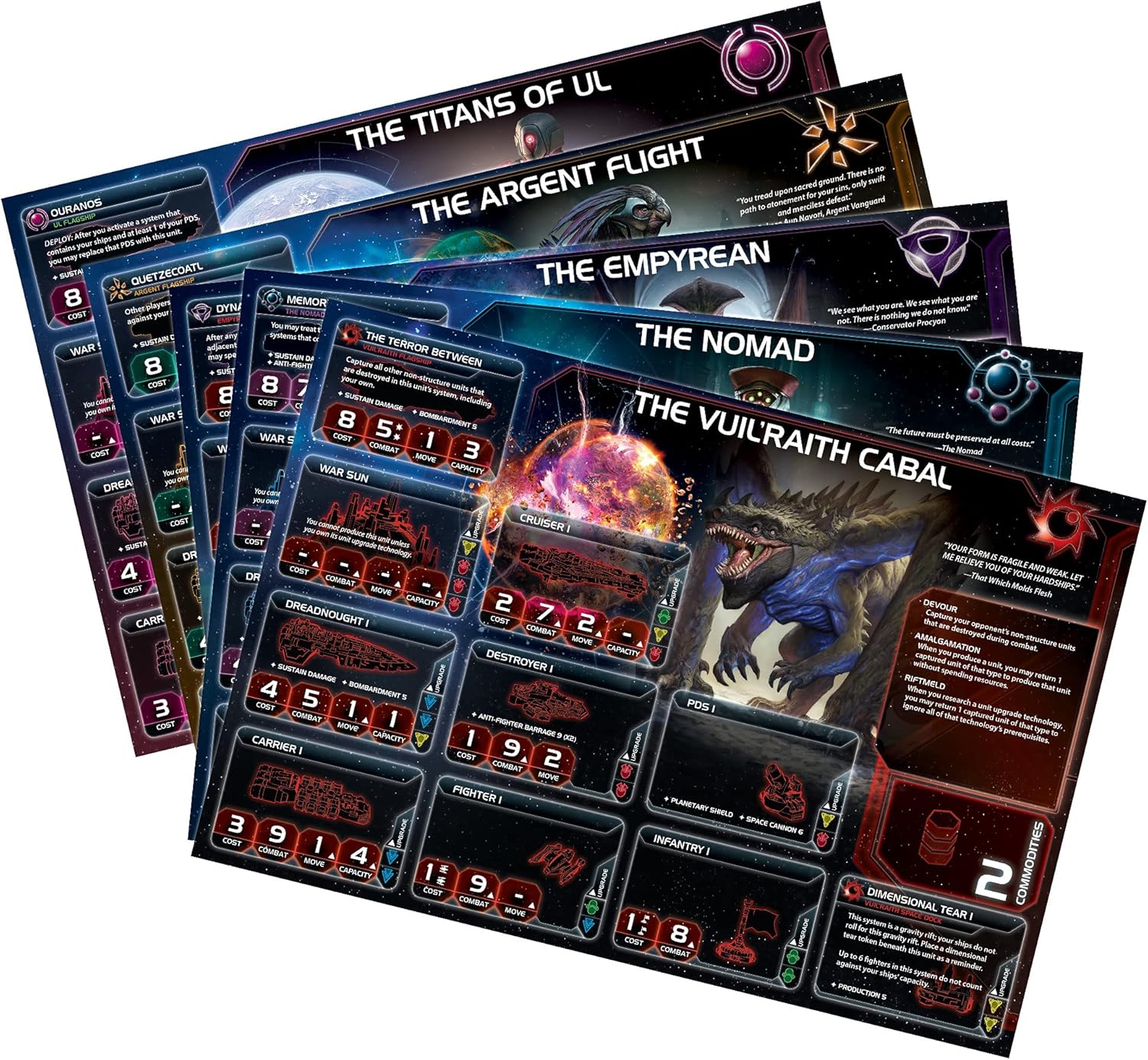 This massive expansion is packed to bursting with new content that you can add to your games of Twilight Imperium. The galaxy has grown far larger, as seven never-before-seen factions enter the game, each boasting their own unique strengths and weaknesses, from the gene-altering powers of the Mahact, to the watchful guard of the Argent Flight, to the mysterious and ancient Empyrean. And new factions aren’t the only way the galaxy grows bigger! Forty new system and hyperlane tiles add new planets and obstacles to the map, and with two new colors of player components included in the Prophecy of Kings expansion, you can play Twilight Imperium with up to eight players.